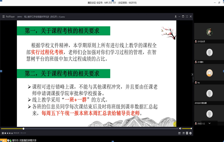 根据校学工部《时代的责任赋予青年 青春的力量彰显担当——同心战“疫”开学第一课》工作部署,我院学生工作队伍3月7日、8日分6场开展了线上首日教育和主题班会活动。学院党委副书记叶华刚、学院副院长孙玉芹结合积极开展的线上教学工作提前录制了音视频,向同学们介绍学校线上教学工作安排。学院各年级辅导员进行集体备课,讲授共抗疫情,爱国力行;敬畏生命,敬畏自然;“逆向”而行、服务一线;学会感恩、与爱同行以及文明上网,聚焦“爱国主义教育、社会责任教育、感恩教育、生命教育和网络道德教育”五个方面开展首日教育。在主题班会对线上教学工作提出要求,介绍了院学生会发出的《同心战“疫” 认真参加线上教学倡议书》,预科班、大一、大二辅导员结合成绩分析,积极开展学风建设,勉励同学们线上教学人到心到;大三辅导员与同学们沟通个人规划,鼓励同学们尽早规划、提前准备考研就业。