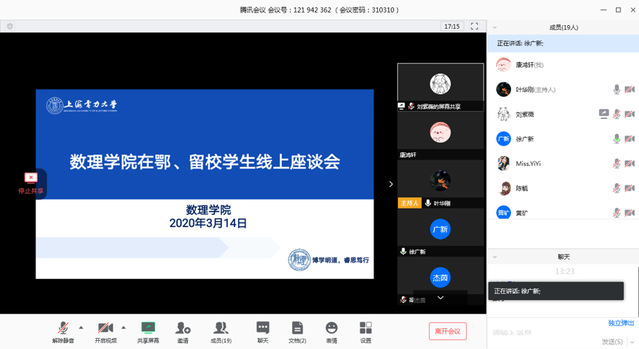 参加座谈同学感谢学院领导、老师的关心,听到老师说“我们虽然身处不同的地方,但我们都有一个共同的名字——’上电人’、‘数理人’”、“学校、学院就是你们的大后方”时,真切地感受到来自学校和学院的温暖,“没有一个冬天不可逾越,没有一个春天不会来临”,坚信在党和国家的领导下,一定能够打赢这场疫情防控阻击战,期盼能够早日回到校园,和老师同学们的相逢!