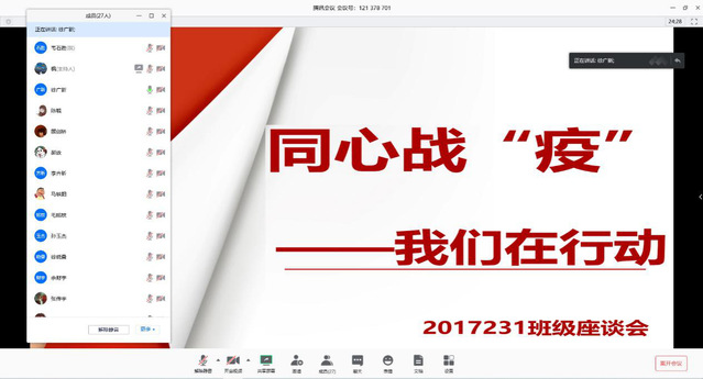 3月27日下午,我院党委书记徐广新在“腾讯会议”线上平台与所联系的2应用物理学2017231班全体学生召开了以“同心战‘疫’——我们在行动”主题班会,辅导员陈毓参加会议。会议由班级团支书刘岩枫主持。