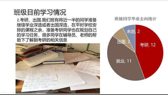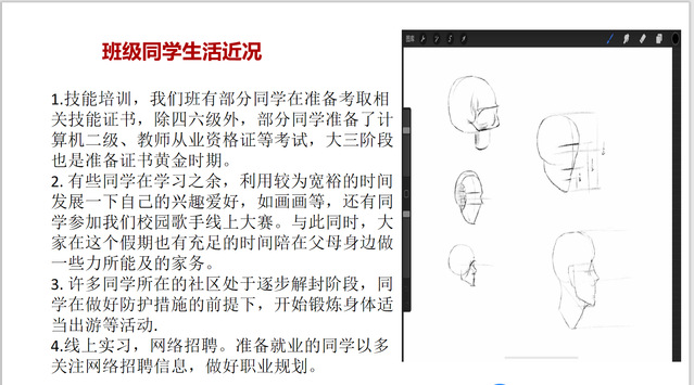 会上,刘岩枫从学生构成、获得荣誉、学分绩分布、欠学分情况等方面进行了班级介绍,结合大三年级特点,分享了班内学生的就业意向统计及职业困惑,并对疫情期间同学们在网课学习及生活近况中存在的困难进行调研与指导。