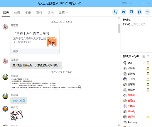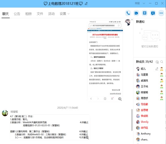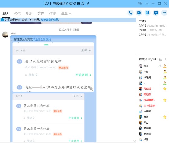由于网课的形式多样化,大家一时间较难适应,所以会不习惯签到、交线上作业等教学活动,而且由于没有身边其他同学的带动,线上学习会因为自己不强的自控力而导致效率低下。宁东、姚瑜韬、付佳鑫等同学在了解到同学们的需求后,为了提高同学们的学习效率、更好地进行教学和学习工作,他们会主动每天定时定点在班级群中提醒大家签到,交作业,参加线上考试,完成预习任务等等,很大程度上调动了同学们的学习积极性。