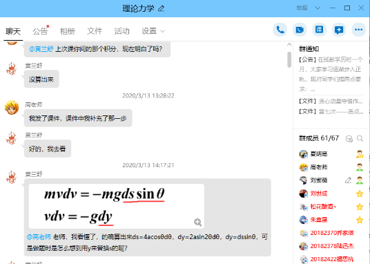 在课下,同学们互帮互助,逐渐适应线上学习节奏,更加自律自觉。在适应线上教学的过程中,部分同学也遇到了很多困难:如有些同学不适应教学节奏或偶尔“开小差”导致无法完全消化知识点,课后无法完成教学任务。在此情况下,同学们之间的交流变得更加频繁,更多“暖心”的事例也由此而生。如2018231班的邓立同学就常常帮助同学,由于本学期应用物理学专业课程难度加大,在平时的学习中,课后会有不少同学在QQ群里提出自己的问题,向同学们求助自己不懂的知识点,邓立同学看到这些同学的发问之后,便竭尽所能去为他们答疑解惑,不厌其烦地仔细为他们讲解。而有些同学对于课业内容实在难以理解,邓立同学甚至主动提出语音或视频电话为他们讲解,实时沟通,更高效地解决了同学们的问题。