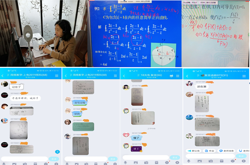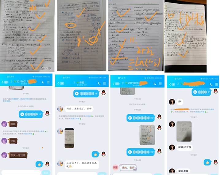 线上教学与线下教学,在作业的批改上区别很大,需要教师及学生及时适应。传统教学,收纸质版作业,一起批改后发给同学。现在学生交电子版,通过使用QQ中的电子笔进行批改,对于容易出错或难于掌握的地方,李老师采用“一对一”的语音指导来加以巩固。虽然增加了工作量,但看到同学们的进步,李老师还是很开心的。课后答疑也是随问随答,为学生解答疑惑。隔离不隔心,隔屏不隔爱,有了李老师线上的陪伴,学生们的学习热情高涨。