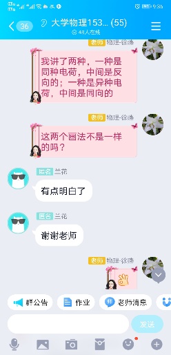 徐燕老师是勤奋钻研的“美女”老师。为了上好在线课程,她和大家一起讨论学习、互相切磋,通过不断的模拟实践,在正式上课前熟练掌握了智慧树平台的使用方法。根据大学物理课程例题多、不易理解、讲授过程需要循序渐进等特点,徐燕老师综合利用one note、whiteboard、math input panel等软件,使它们在线上投屏教学的过程中起到了非常好的辅助作用。