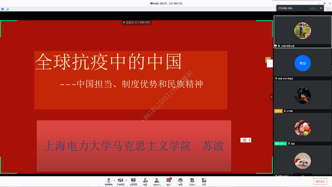 5月8日下午,我校马克思主义学院苏波老师作了《疫情防控斗争中的中国担当》党课。2020年新冠肺炎疫情爆发,迅速蔓延全球,中国作为全球抗疫的重要战场,用实际行动诠释大国担当,用制度优势交出满意“答卷”,用中国精神体现当代价值。苏波老师从“中国力助全球抗疫诠释大国责任担当,从疫情防控读懂中国制度优势,战疫面前凝聚起中国精神磅礴伟力”三方面展开讲述,鼓励学员在疫情期间要学会奉献,勇于承担起新时代中国青年大学生的责任与担当,积极投身于疫情防控阻击战。此次党课将爱国精神、斗争精神、奉献精神、科学精神、团结精神融于其中。培训班学员表示要端正入党动机,不忘初心、牢记使命,以祖国为骄傲,传承和弘扬中国精神,以实际行动向党组织靠拢。