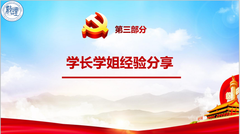 在经验交流分享环节,2016级五位不同专业考研成功的学生分享了他们的考研心得。他们简要介绍自己考取院校专业的招录情况,指导学弟学妹们如何确立考研目标,并阐明坚持目标的重要性。戴兴龙十分强调时间管理,他说“在时间规划方面尤其要切记,制定合理的复习计划,高效备考,及时调整节奏并坚持下去,不要与他人攀比,要踏踏实实,严格推进备考进程。”此外,范静怡、王康、冯晓鸥和于智乾四位同学分别在对信息查询、备考资料、重要方法、平稳心态等方面介绍了自身经验,强调掌握有效获取途径用好微信公众号、中国大学慕课、B站、考研QQ群等互联网资源,鼓励同学们在考研路上坚定信念,勇往直前。