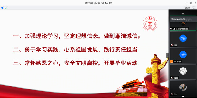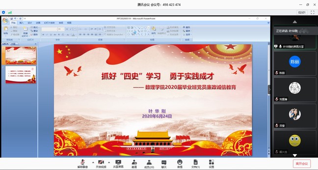 在即将迎来中国共产党建党99周年前夕,6月24日,澳门十大信誉好的网站在线上腾讯会议开展了毕业班学生党员离校教育暨党员廉洁诚信专题教育。学院党委副书记叶华刚、专职组织员吕莹、信物本科生低年级党支部书记刘紫薇、毕业班辅导员康鸿轩及全体毕业生党员参加会议。