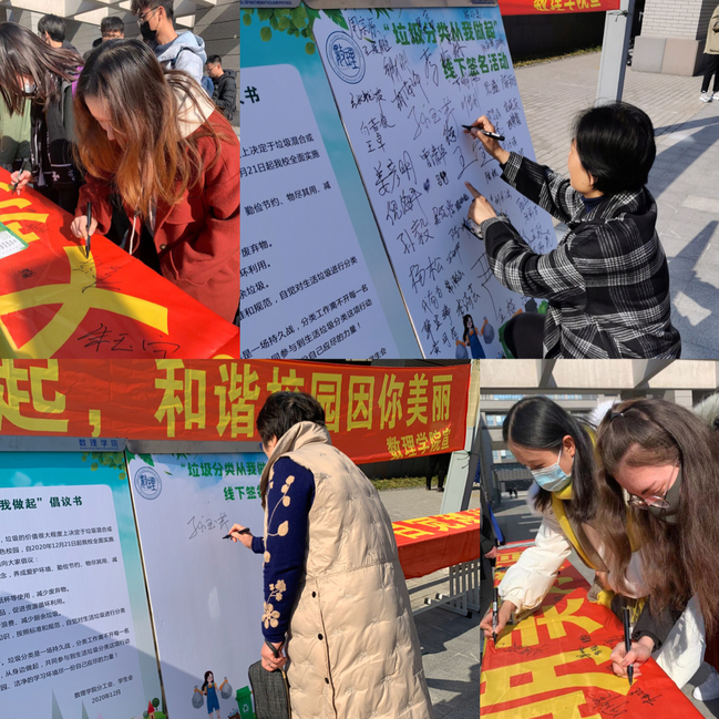 活动中学院志愿者为前来参加活动的同学发放《垃圾分类宣传手册》,详细向同学们介绍学校垃圾定点投放的地点、时间,如何在寝室做好垃圾分类等。学院老师、同学及志愿者纷纷在“倡议书”签名板上签名。