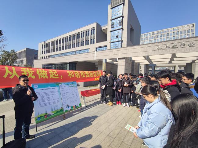 12月21日中午,我院在临港校区执勤点开展了垃圾分类宣传及线下签名活动。现场设置横幅“垃圾分类从我做起,和谐校园因你美丽”、“自觉规范垃圾分类,共创文明美好校园”。学院党委副书记叶华刚向在场师生介绍了开展垃圾分类工作的意义及学校垃圾分类集中投放及定时定点管理的规定,倡导各班级学生党员、学生干部积极带头做好垃圾分类,带动班级学生养成垃圾分类的习惯。