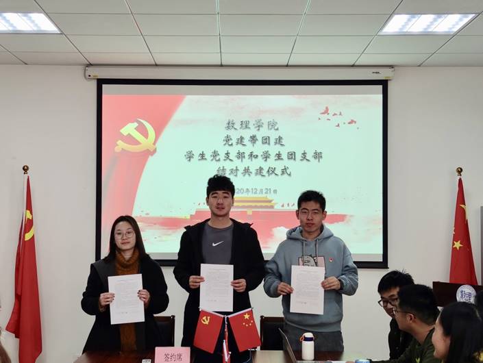 为贯彻落实以习近平新时代中国特色社会主义思想铸魂育人,加强对团员青年的政治引领,提升学院班级团支部的组织力和工作活力建设,发挥学生党员的带头示范作用。12月21日,澳门十大信誉好的网站在临港校区数理楼B301会议室举行党建带团建结对签约仪式,学院党委副书记叶华刚、信物本科生低年级党支部书记刘紫薇、分团委挂职副书记康鸿轩、2020级学生辅导员杨雪艺、高年级学生党员及大一年级团支书等参加。签约式由刘紫薇主持。