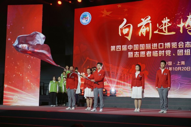 仪式上,上海市政府副秘书长、进博会城市服务保障领导小组志愿者服务保障组组长赵祝平为第四届进博会志愿者总队授旗。黄晨承担了接旗手的光荣任务,让进博会的大旗在馆内飘扬。