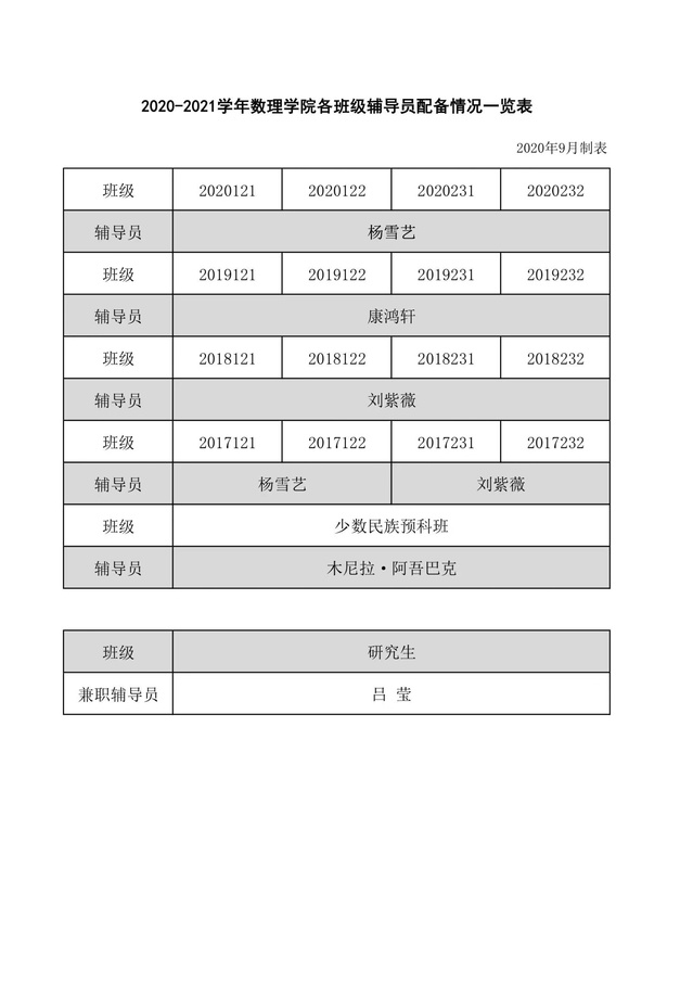 2020-2021学年澳门十大信誉好的网站各班级辅导员配备情况一览表