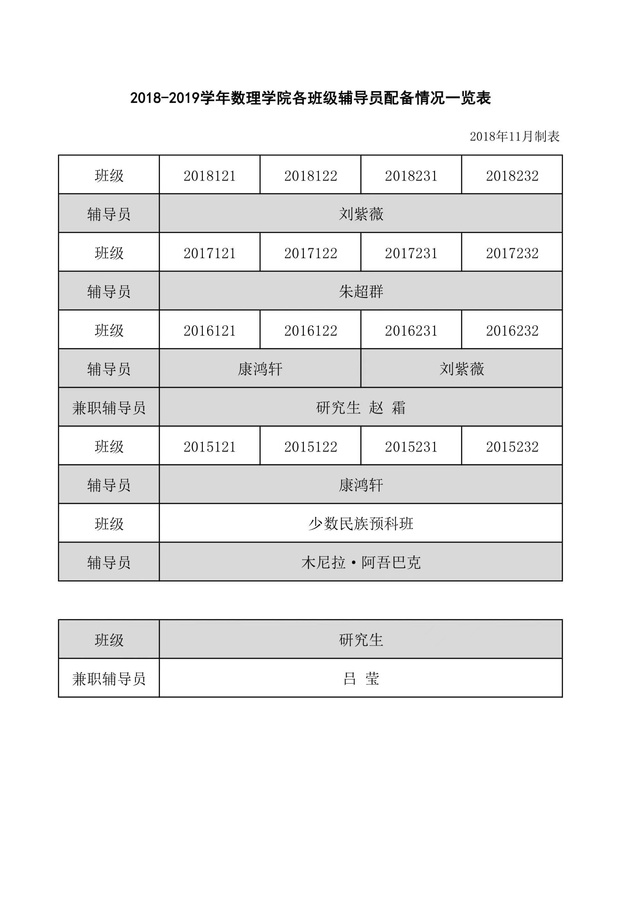 2018-2019学年澳门十大信誉好的网站各班级辅导员配备情况一览表